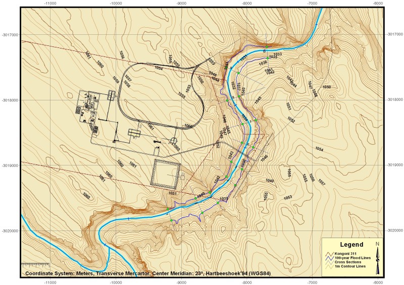 The flood lines AED produce are done in accordance with official modelling techniques developed specifically for South African conditions and are accepted throughout South Africa by all Government Departments. We can produce flood lines with return intervals from as short as 2 years up to 100 (or even more) years. The flood lines are made available in Shape File, DXF/DWG format (or any other CAD format) to the client, using whichever co-ordinate system the client prefers.