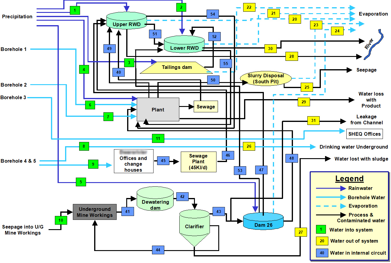 Under normal circumstances, when determining water balances, one tends to only refer to the hydraulic balance, i.e. the accounting of all the in- and output volumes entering and leaving a system. Opposed to this, a water and salt balance uses the hydraulic balance, but then also accounts for the dissolved solids carried in the water streams. In other words, a water and salt balance can be seen as a means of accounting for all the products carried in a system where the one value can be used to verify the accuracy of the other. A Water and Salt balance can best be described as a management tool, which assists the user in determining not only the concentration of dissolved solids in a body of water, but also more importantly, to determine the mass of salts carried in a dynamic system. Such a system can be river or a network of pipes, tanks and channels such as encountered in a metallurgical plant or at a mineshaft, or, for that matter, any other type of industry that uses water in its process.